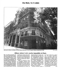 13.11.2003 Die Welt Allianz sichert sich zweite Immobilie in Paris, ... mehr ... |